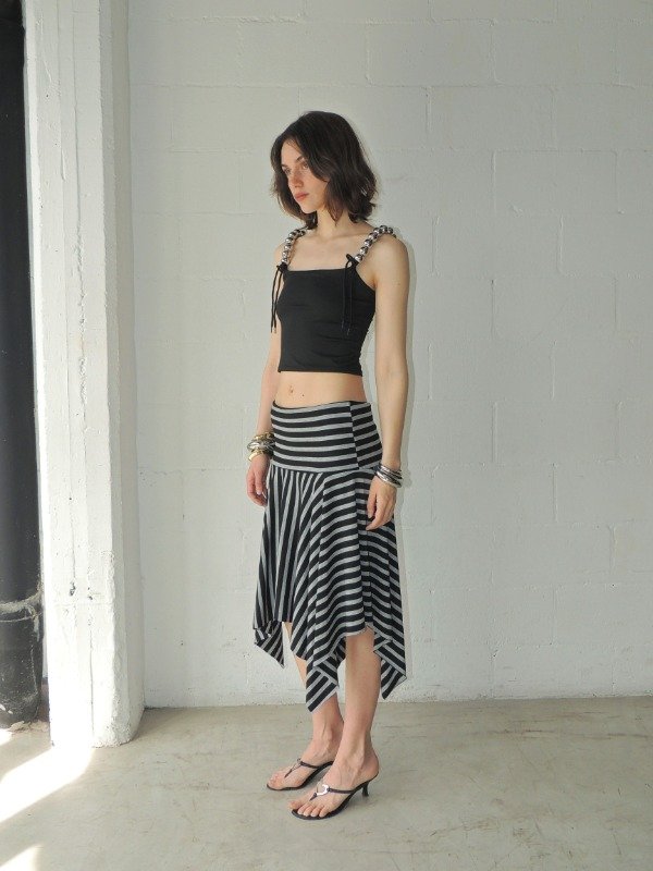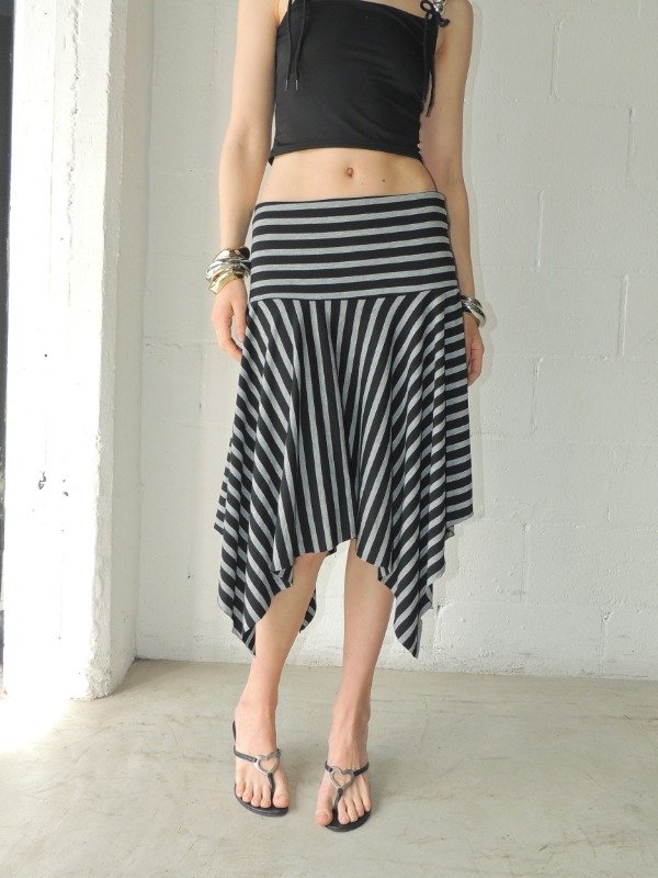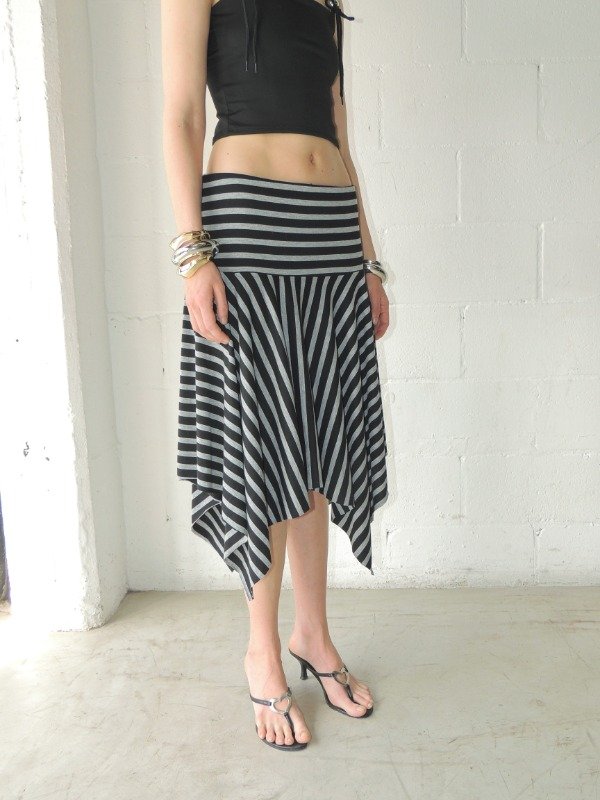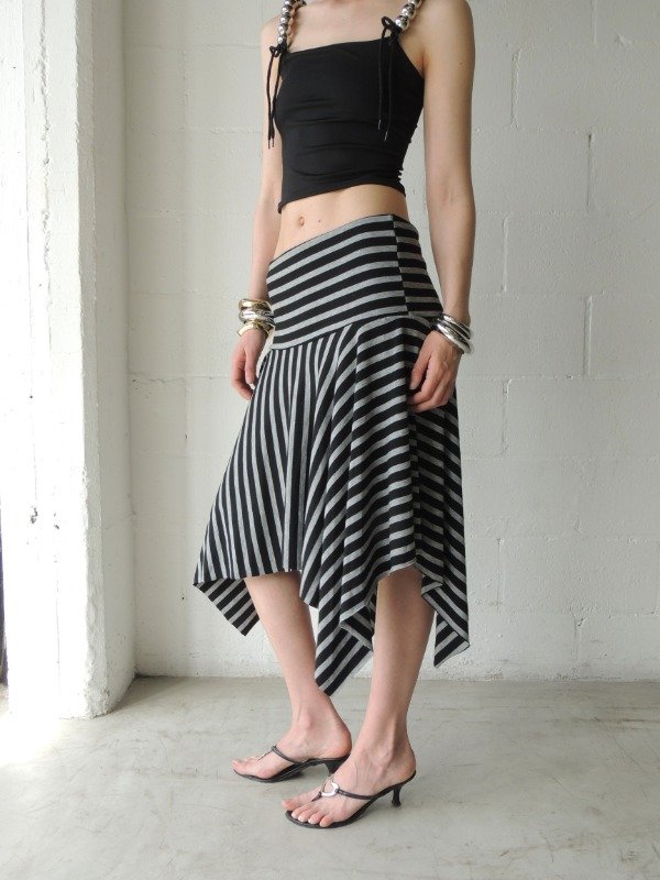 Falda confeccionada en algodón elastizado a rayas. Su diseño presenta un un corte con vuelo y picos asimétricos, que aportan movimiento.Cintura ancha y ceñida, con buen calce y realce de la silueta. El juego de rayas en distintas direcciones genera contraste y acentúa la fluidez de la prenda.