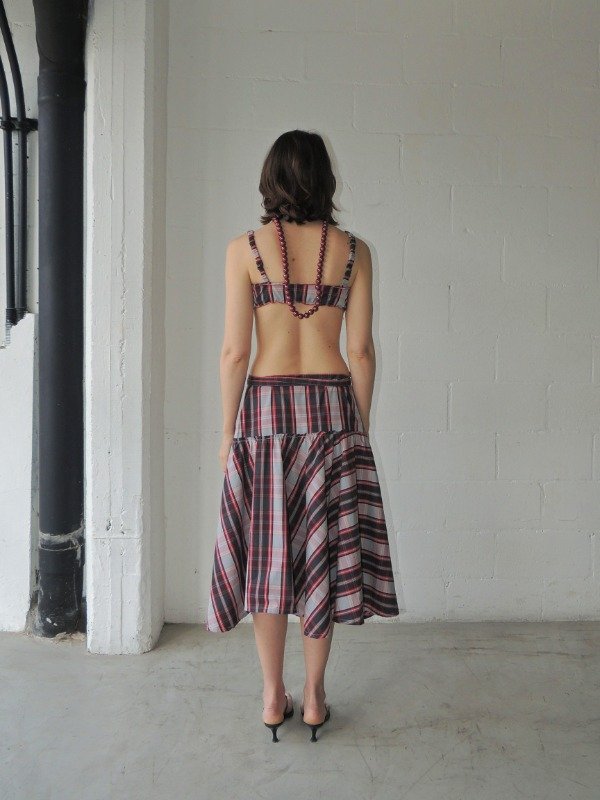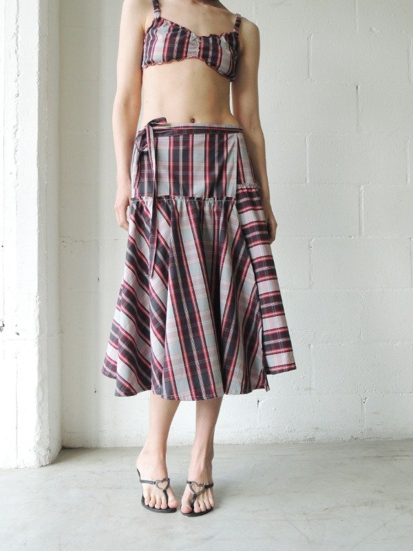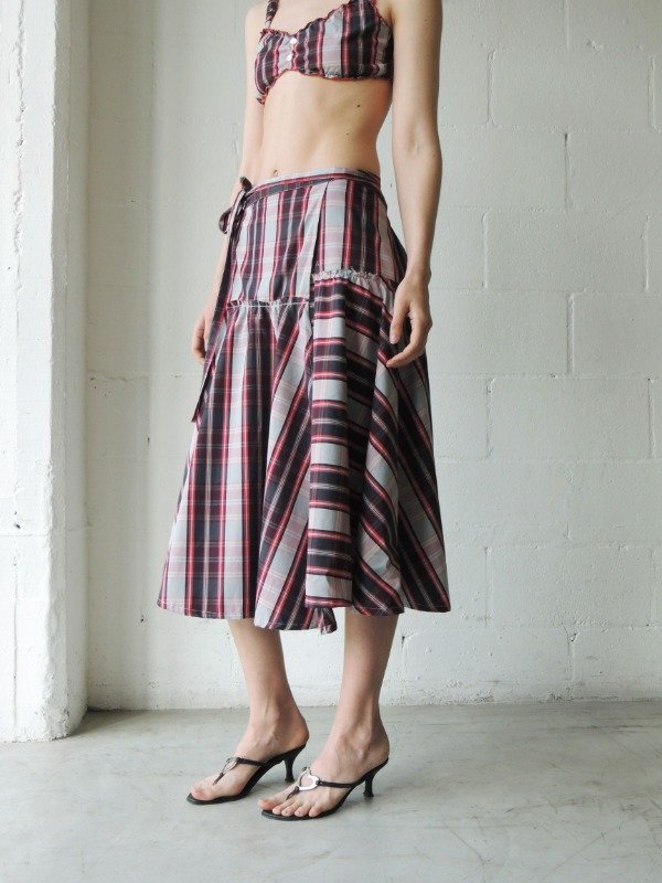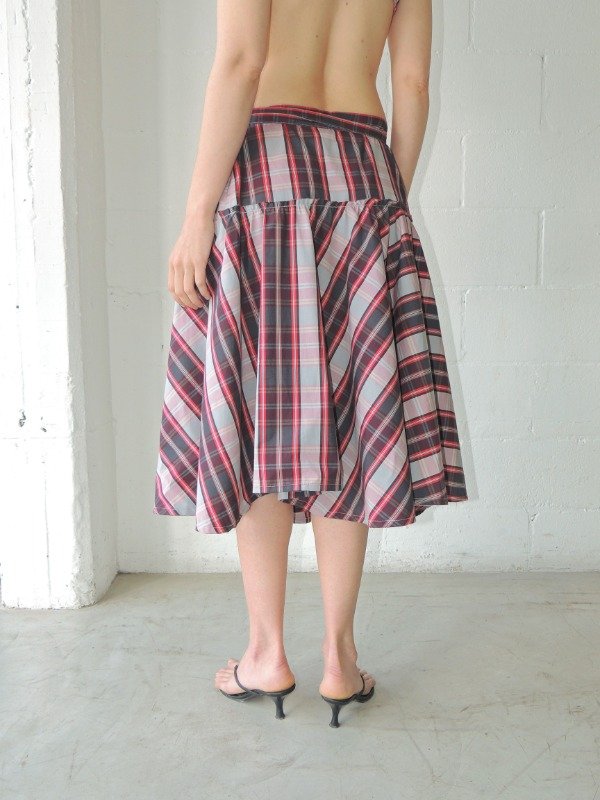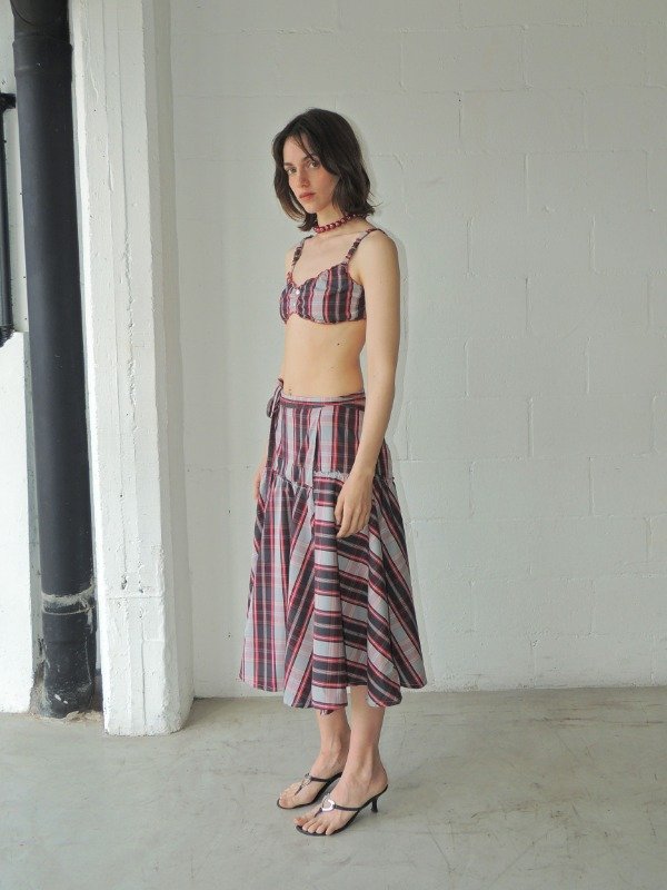 Falda midi confeccionada en poplin tartán. Su diseño es tipo portafolio cruzado, lo que permite un ajuste regulable en la cintura gracias a su sistema de amarre lateral. Presenta un corte amplio con vuelo y paneles que realzan el volumen de la prenda.