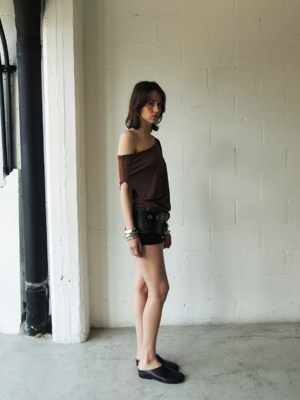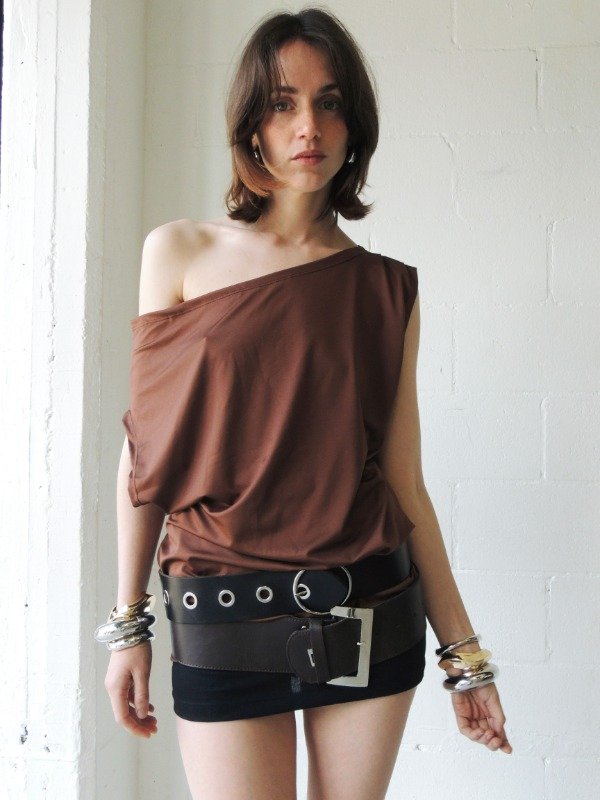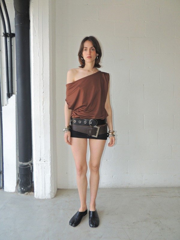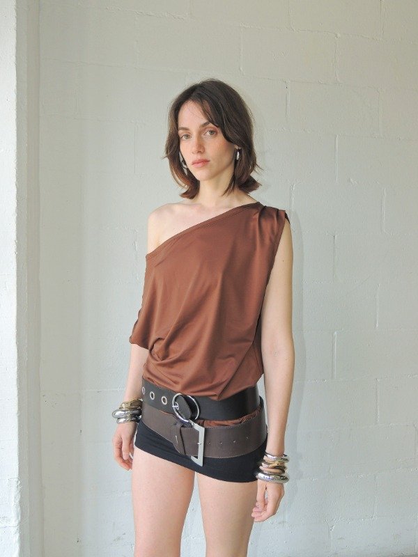 Blusa confeccionada en tela Microfibra negra Oversized con Cuello bote y hombro al descubierto, detalle de pliegues en hombro derecho.