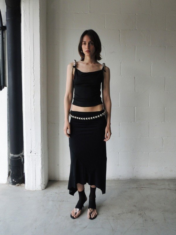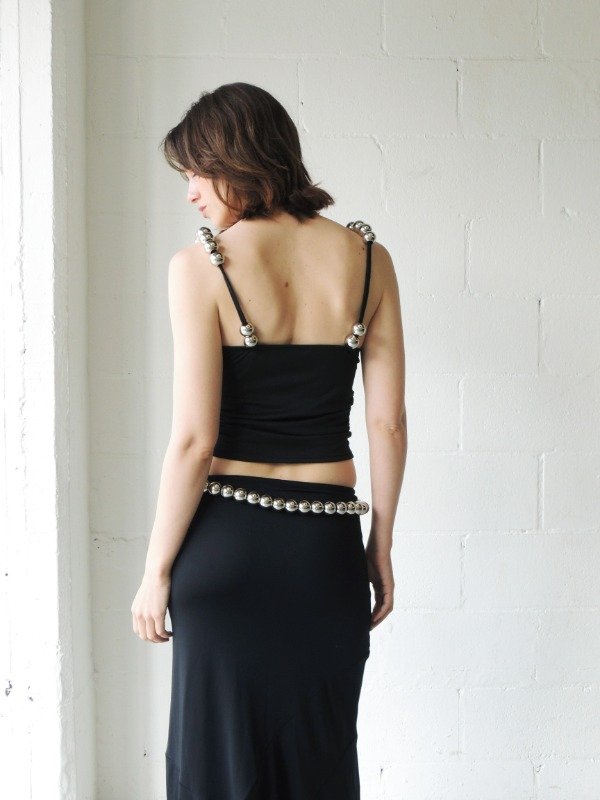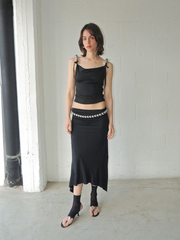 Top confeccionado en microfibra elastizada con acabado satinado, que asegura comodidad, ajuste y un calce perfecto al cuerpo. Presenta un escote drapeado suave y breteles compuestos por cordones regulables con aplicación de esferas metálicas de gran tamaño, que funcionan como detalle ornamental y estructural. Los laterales incluyen frunces que permiten un mejor ajuste y resaltan la silueta.