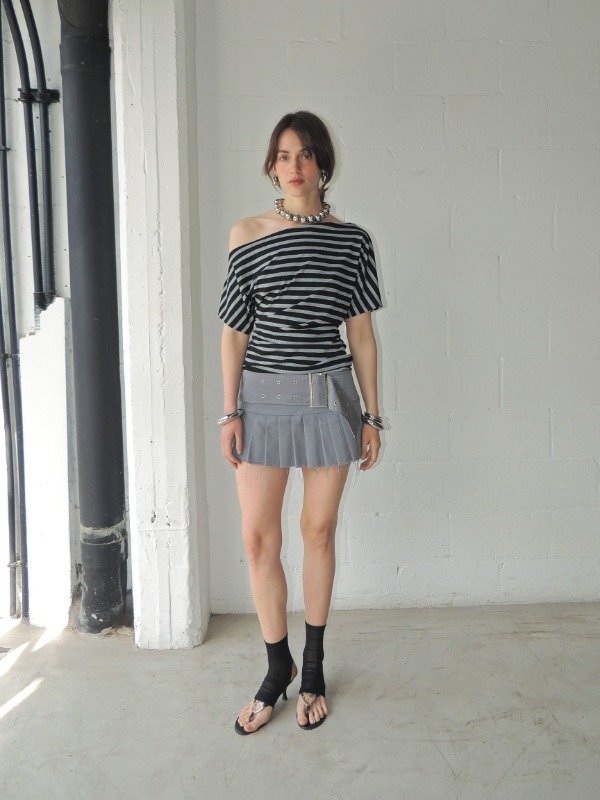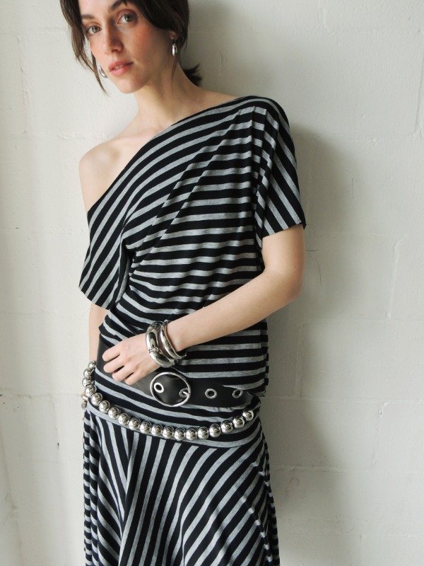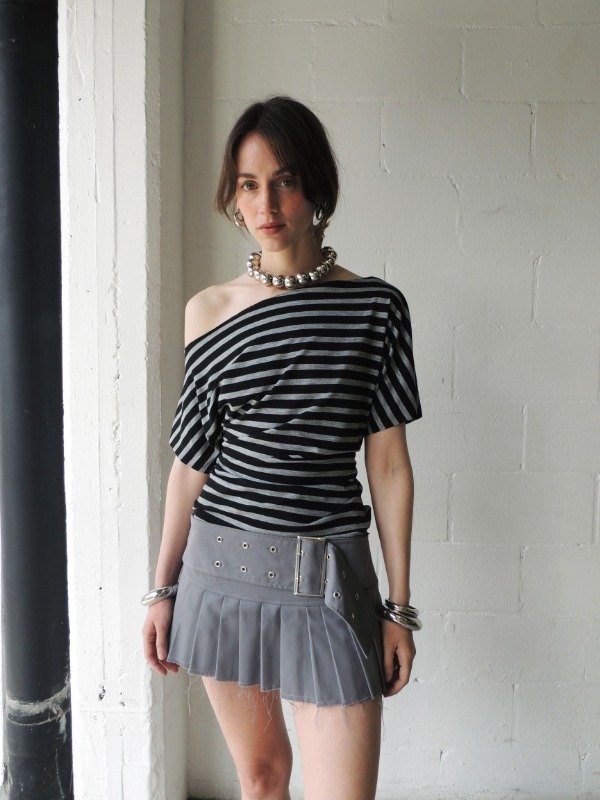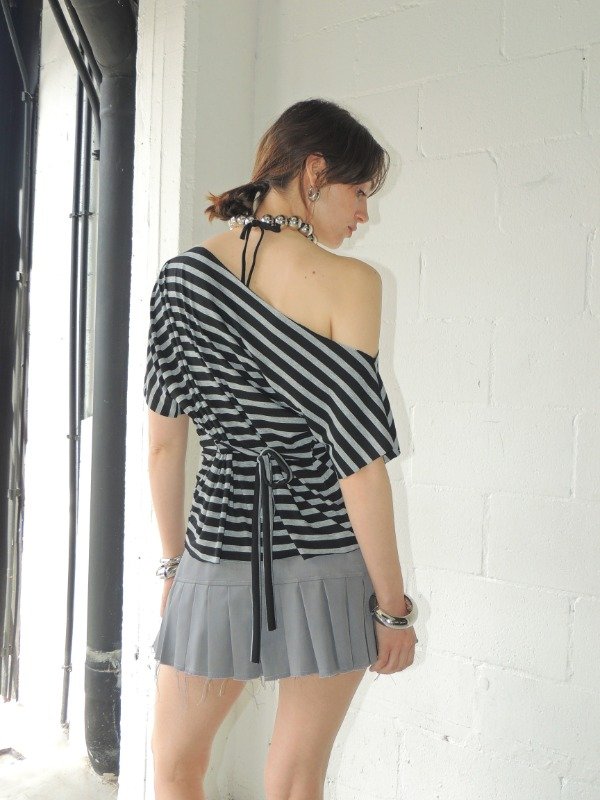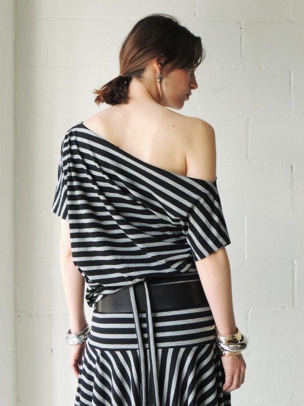 Top confeccionado en algodón elastizado a rayas. Su diseño es versátil, ya que puede usarse en silueta oversize o ajustado a la cintura mediante los lazos incorporados en sus laterales, que permiten regular el calce. Presenta escote amplio y hombro caído.