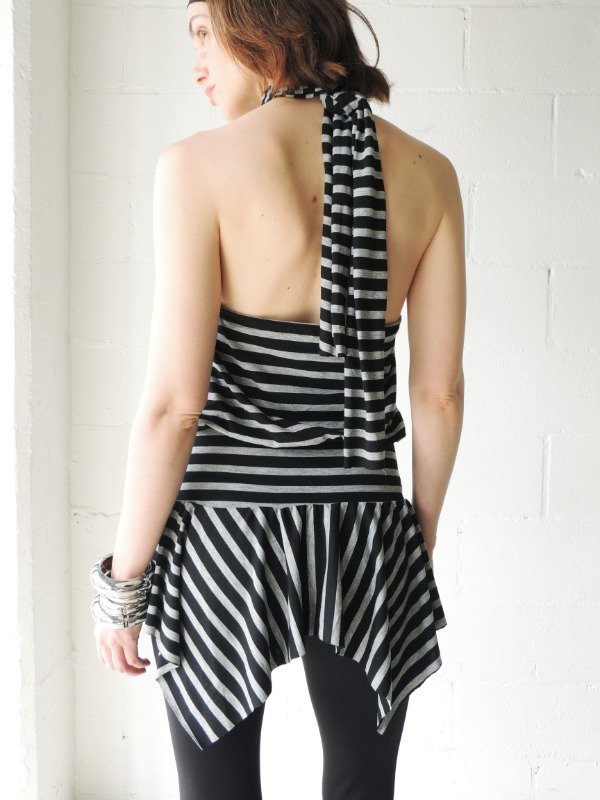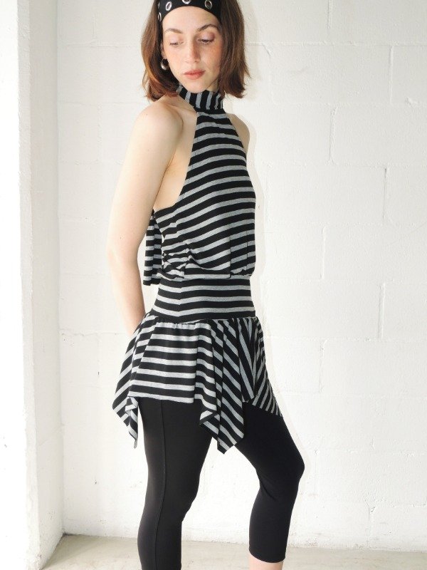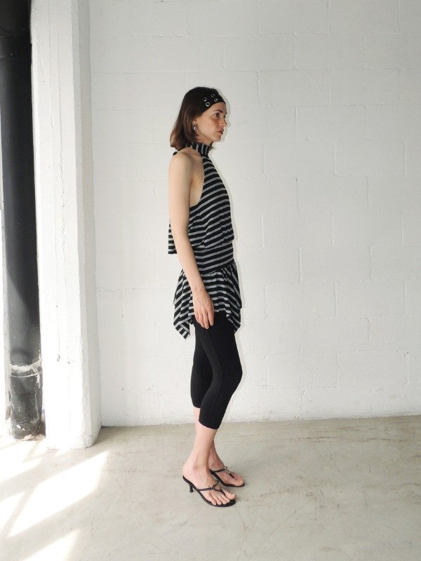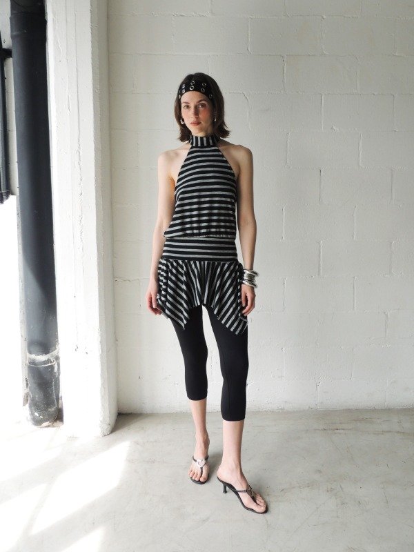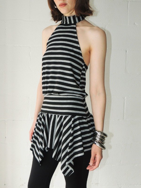 Vestido corto confeccionado en algodón elastizado a rayas. Presenta un diseño sin mangas con cuello alto tipo halter, dejando la espalda descubierta con amarre en la nuca. La parte inferior incorpora un volado irregular estilo que aporta movimiento y asimetría.