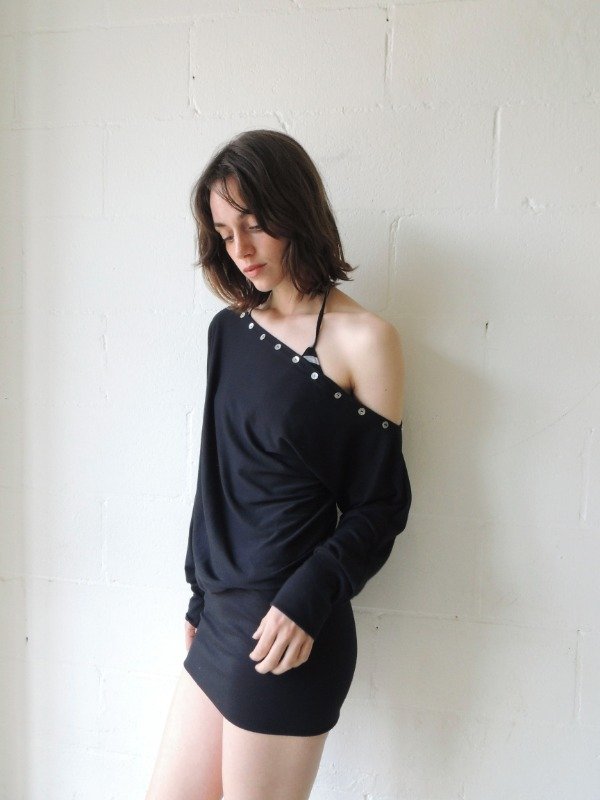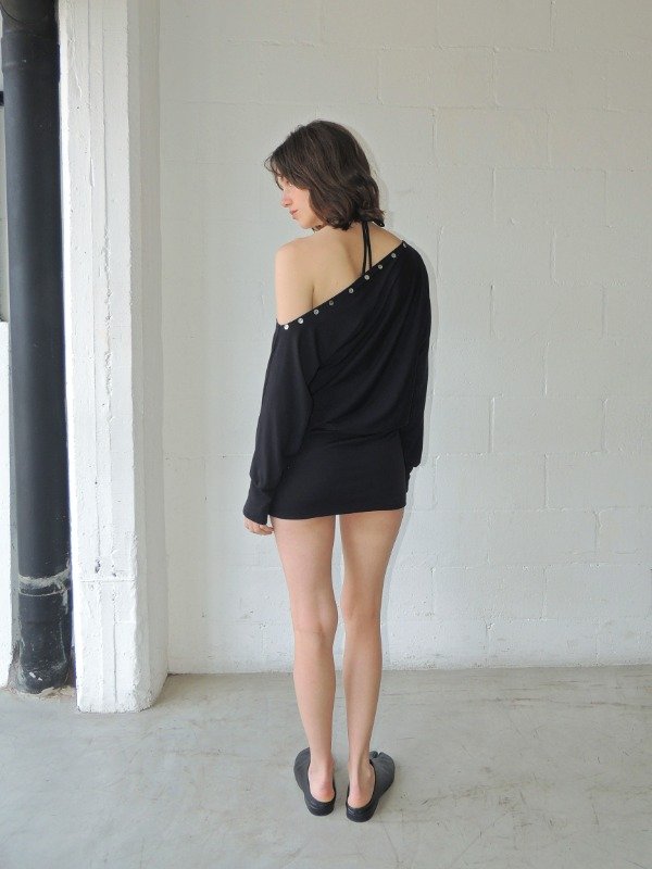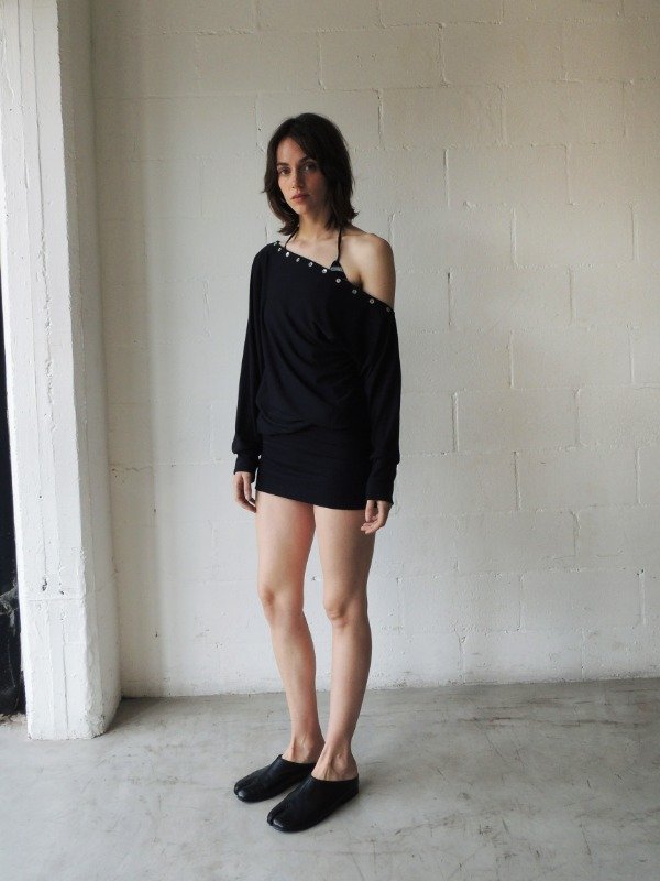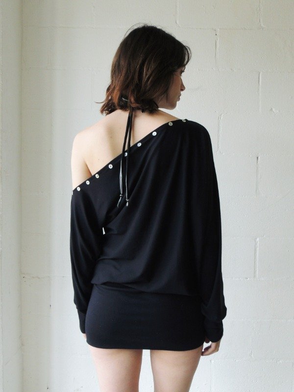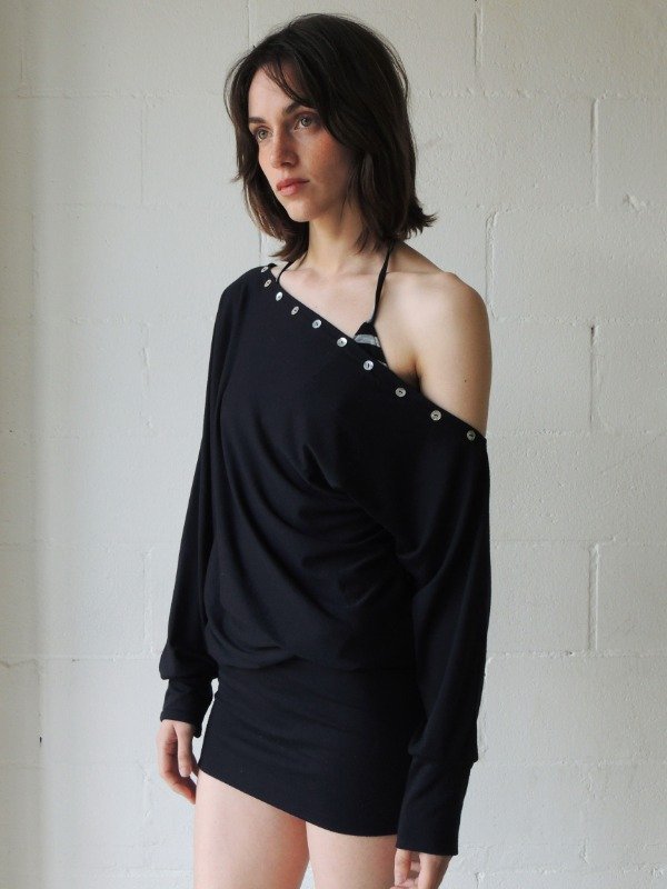 Vestido corto confeccionado en modal elastizado, presenta un diseño asimétrico de un solo hombro, con escote decorado por una hilera de botones nacarados, mangas largas.
